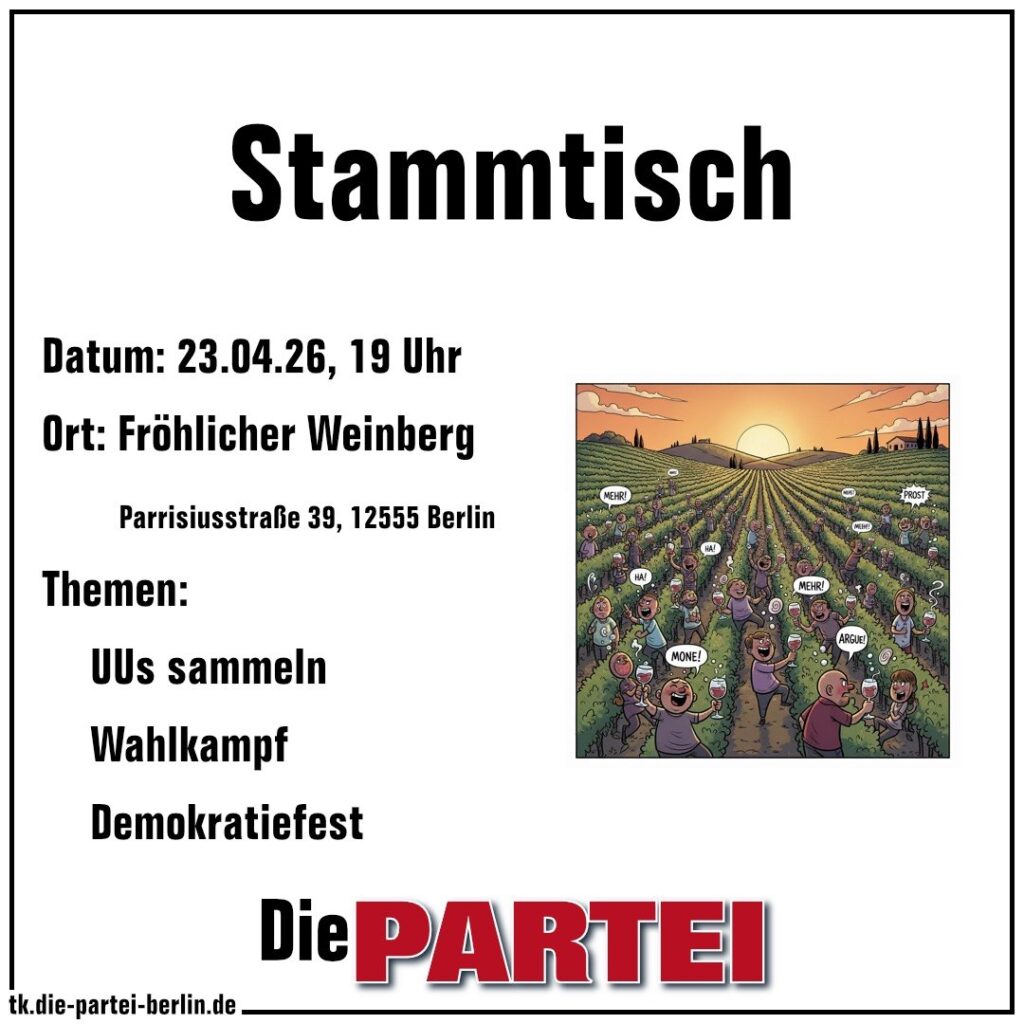 Der Ortsverband DIE PARTEI Treptow-Köpenick lädt zum Stammtisch: